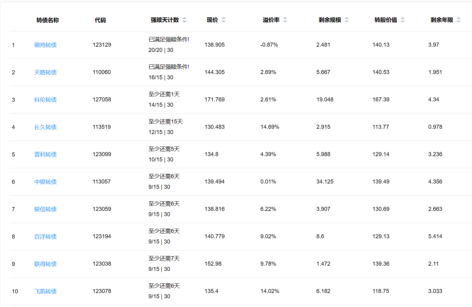 2、即将满足强赎转债