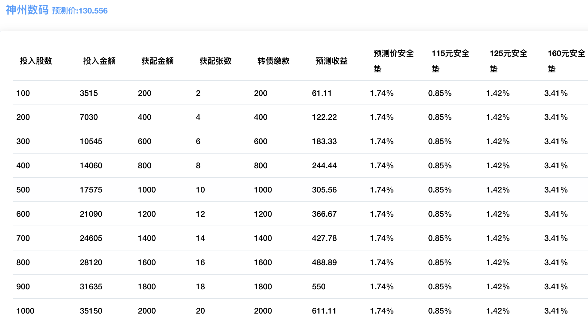 以当前转股价值预测上市价在130元左右,配债所需股数和安全垫可以参考下图:
