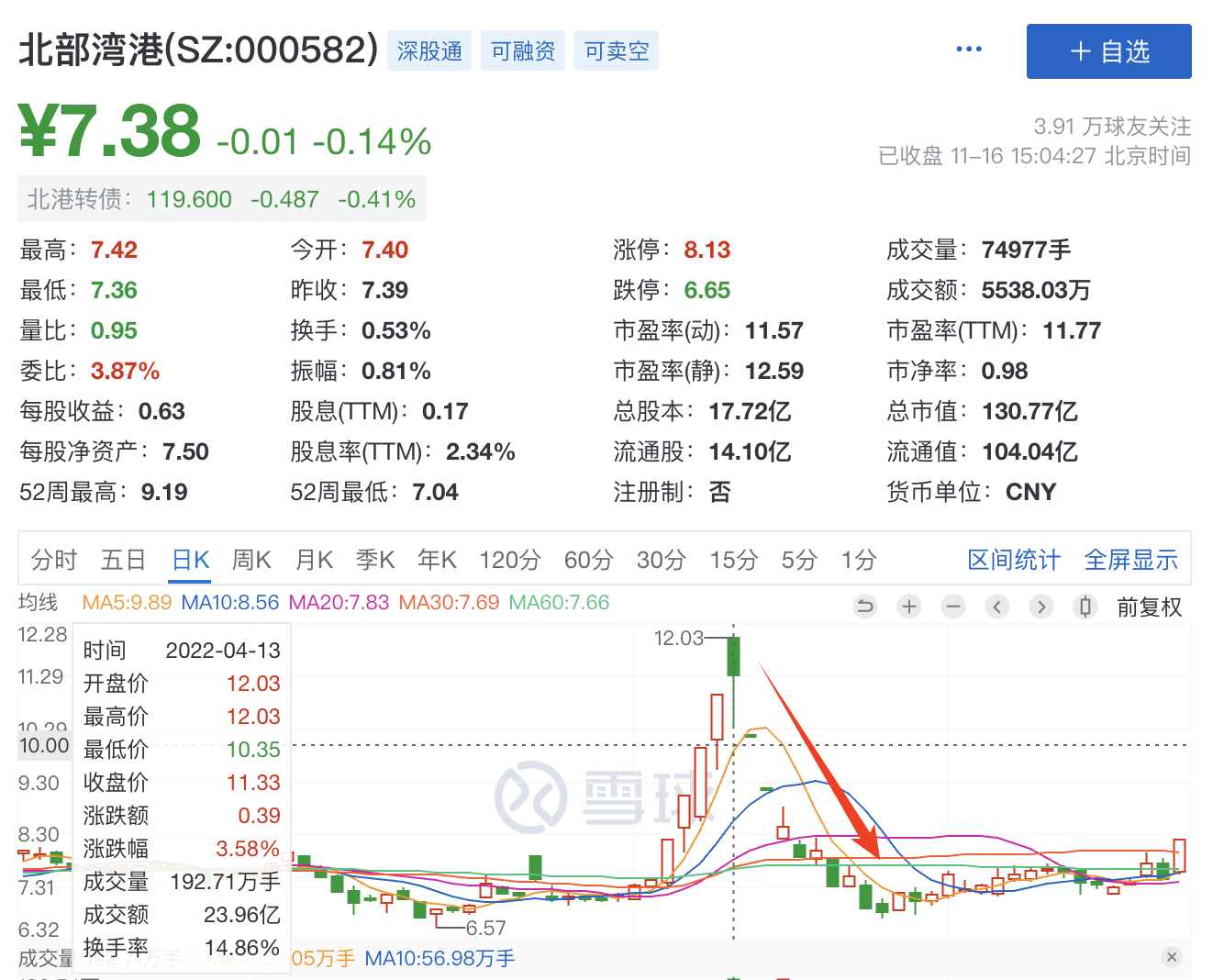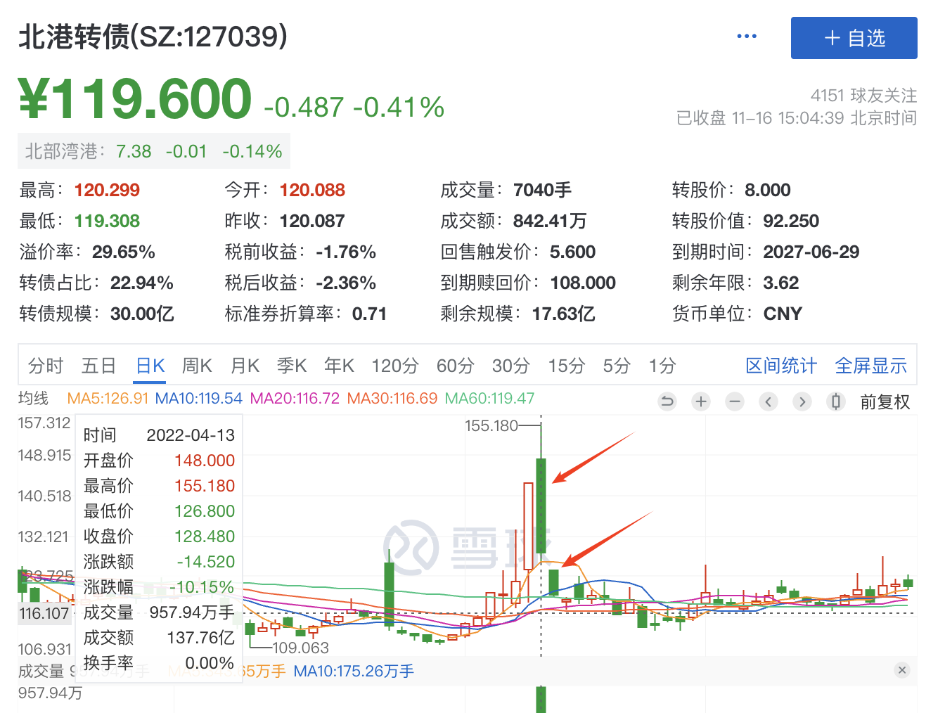 当天在正股涨停的时候,北港转债折价6%,尾盘正股北部港湾突然开板,极速下跌,转债也跟着下跌,一下子折价了超过10%,收盘折价9.47%……