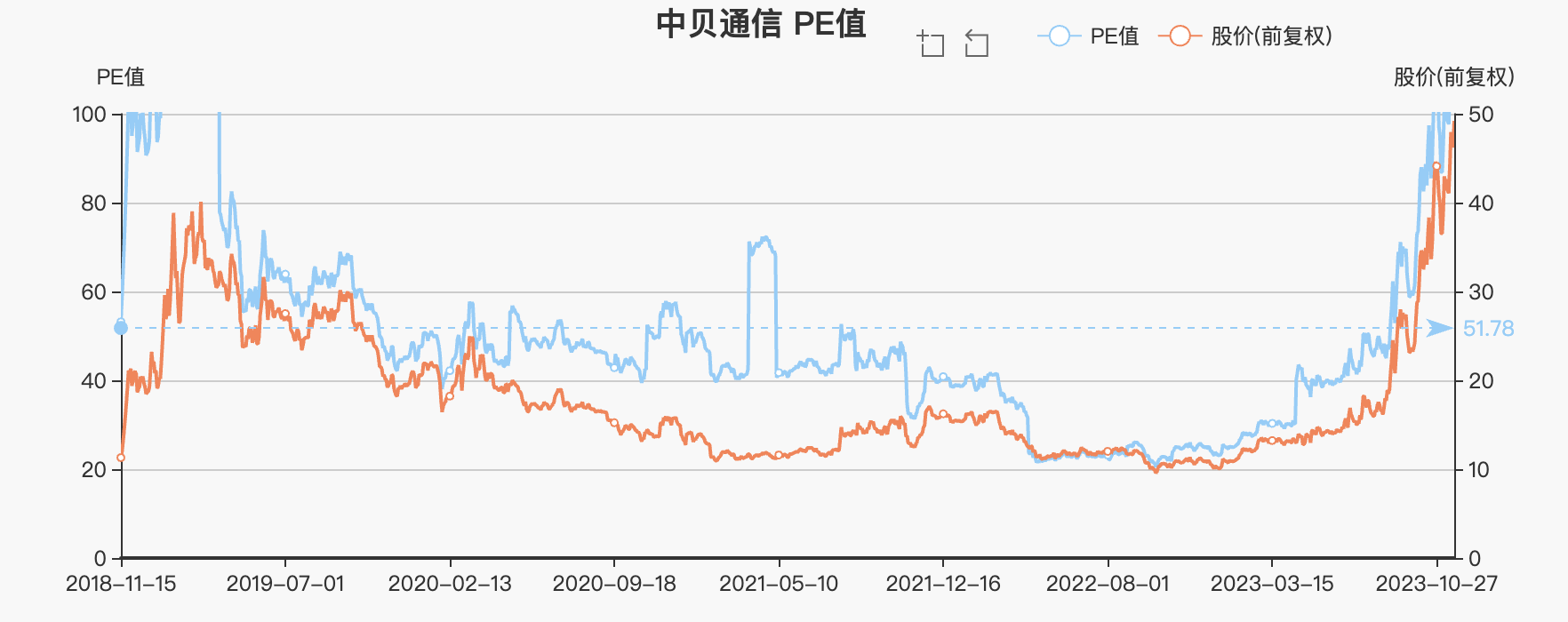 中贝通信从2022-12-30的10.10元,涨到如今的49.20元,今年累计涨幅已经高达358.52%,它也是国证2000、小盘股中的成分股,目前PE百分位:95.65%,PB百分位:95.32%,股价已经在很高位了,追高风险很大。
