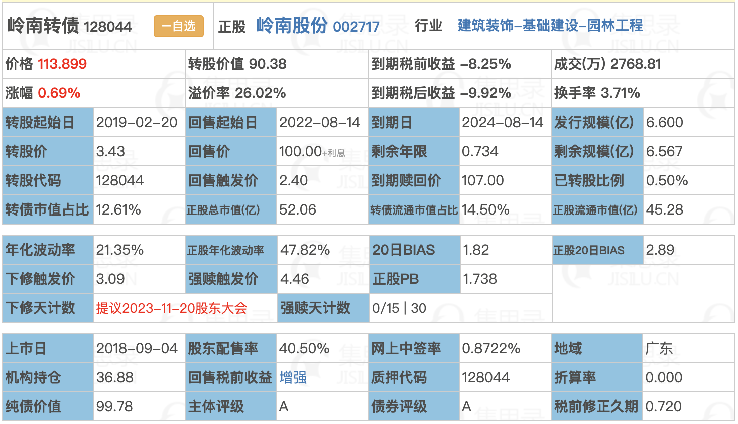 它目前最大的问题是剩余年限只有0.734年,明年的8月14到期,今年以来,一年以内到期的转债溢价率都被压缩的很厉害,活跃度大大降低。在临期债中岭南算是比较努力的,先后主动下修过3次,一直在努力提升转股价值,这对投资者来说是好事儿。