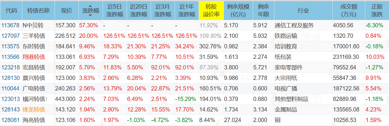 1)中贝转债,尽管今天正股大跌6.3%,但是转股价值依然高达140.55元,收盘不出意外达成首日最高价157.3元。
