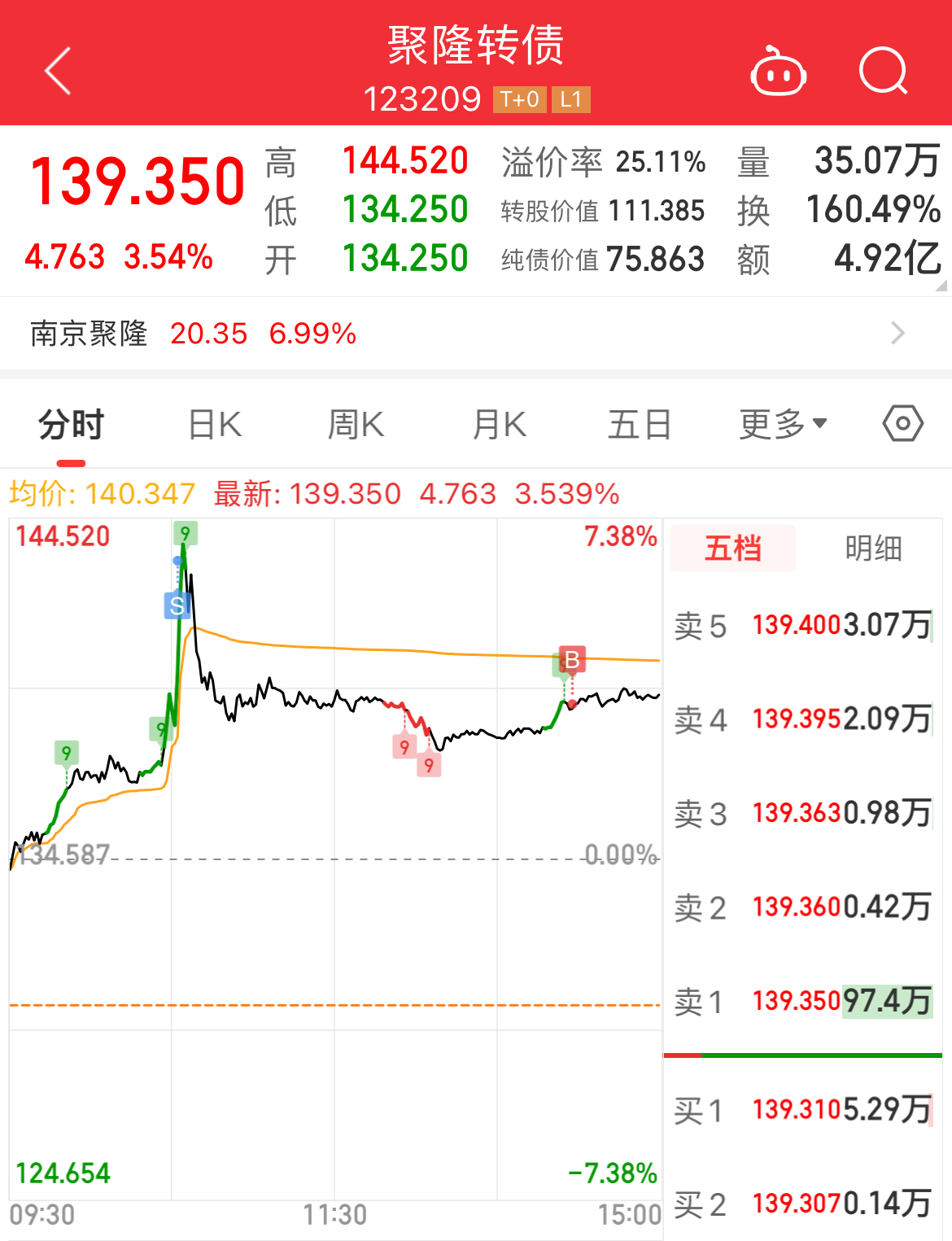 4)操作建议:如果中签,可以考虑设置一个回落条件单,基准价123元,回落0.5%,买三价卖出。
