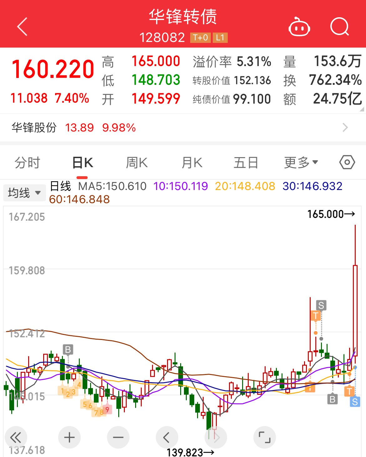 华锋转债是11-22建仓的,建仓价147.618,今天分批卖出,均价160.313清仓,持股5天,共盈利8.6%。