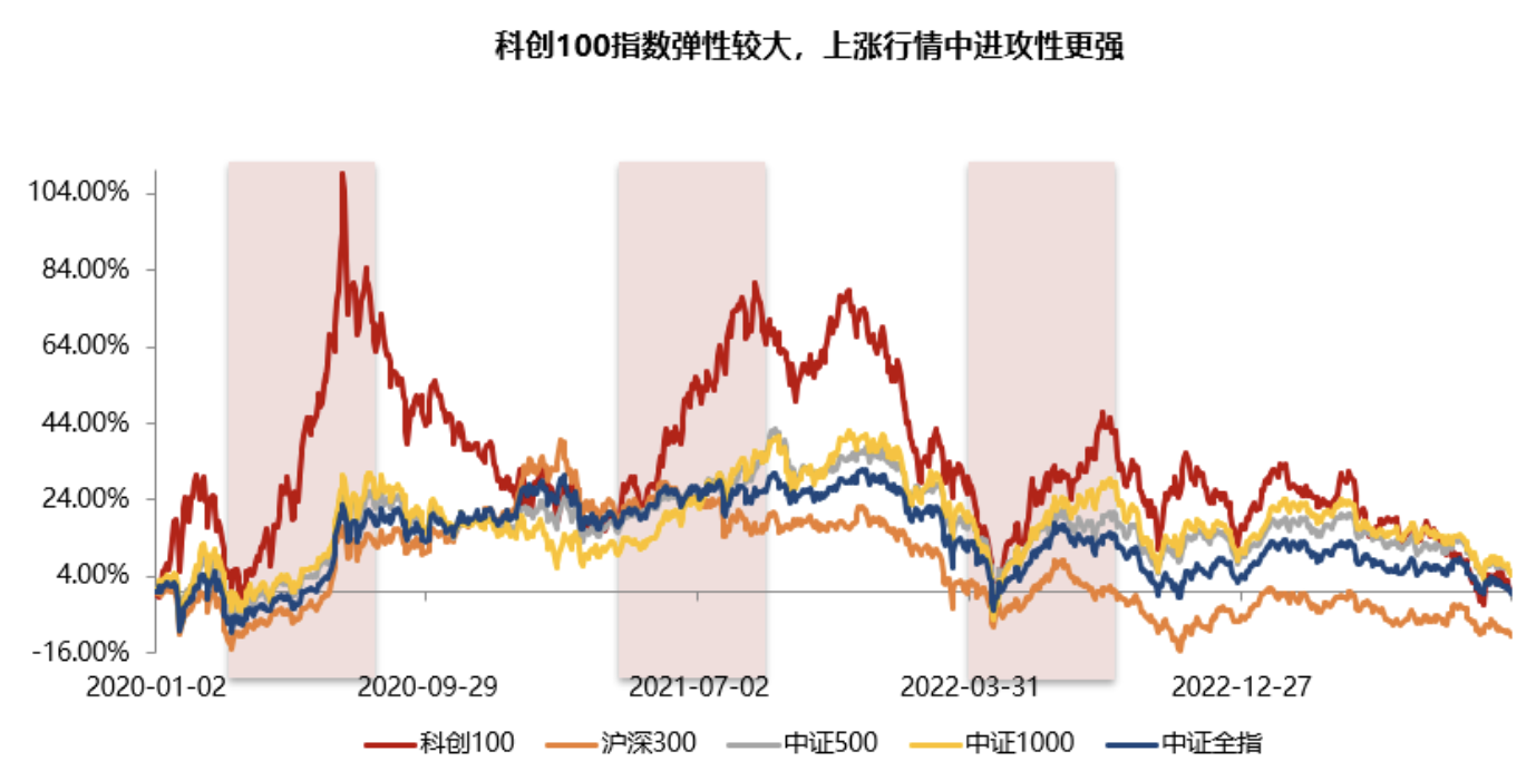 回望2020年中、2021年中和2022年中三段科创板走强的阶段,科创100的涨幅远超中证500、中证1000等成长性指数,在上涨行情中体现出冲劲十足。