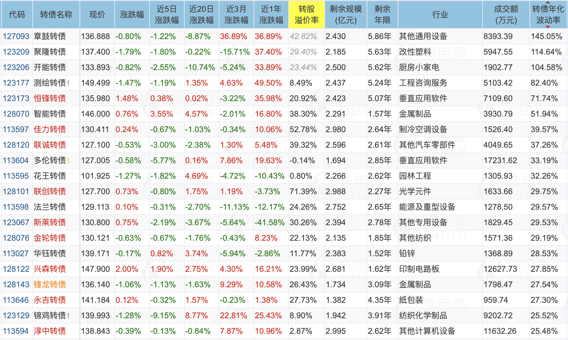 下面这些是150元以下,剩余规模3亿以下,剩余年限1.5年以上,转债年化波动率最高的20只转债,除去正股st的花王和已经强赎的多伦转债,其余转债暂时都没有强赎和暴雷风险,兼具安全度和活跃度。