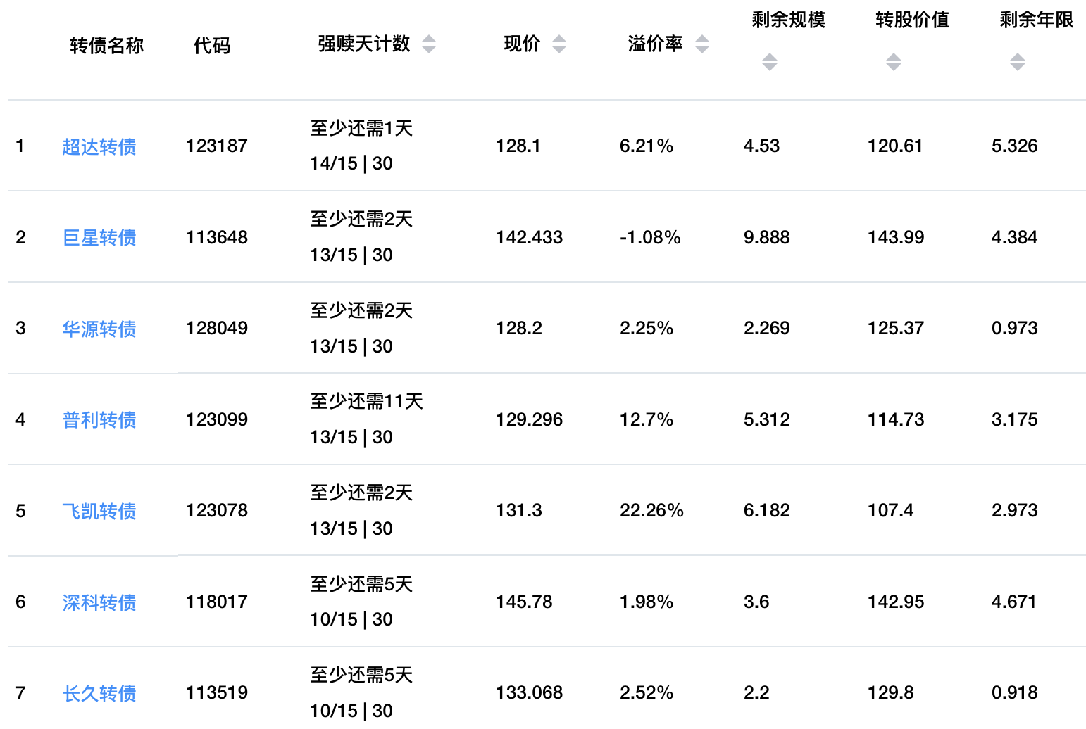 下周以下这些转债有可能满足15天强赎条件,不过除了巨星转债,其余转债当前转股价值都不满足强赎计数条件,当前风险均不大。