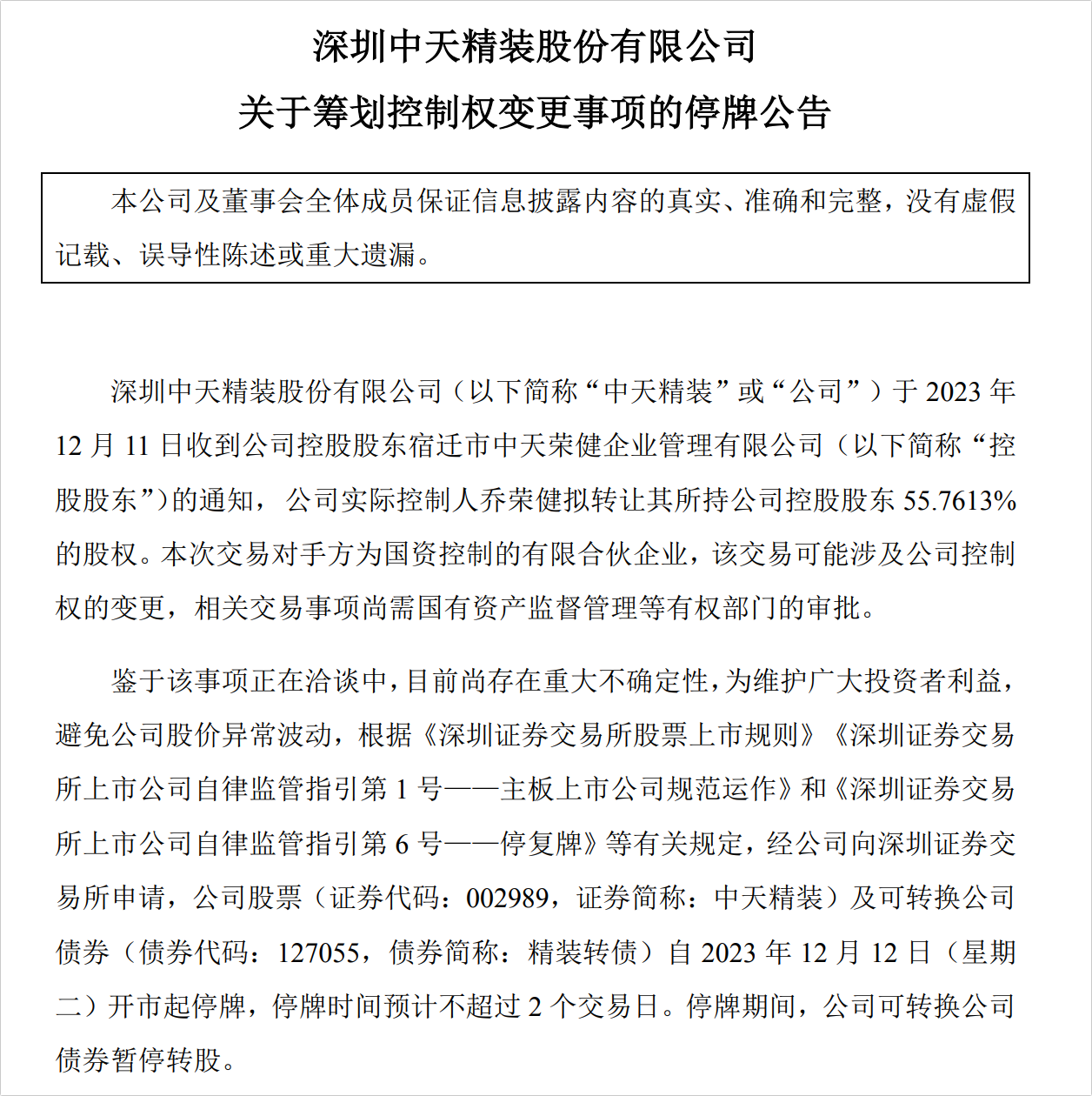 中天精装今日停盘,原因是正股中天精装的控股股东乔荣健拟转让55.7613%的股权。交易对手方为国资企业,该交易可能涉及公司控制权的变更,相关交易事项尚需国有资产监督管理等有权部门的审批。