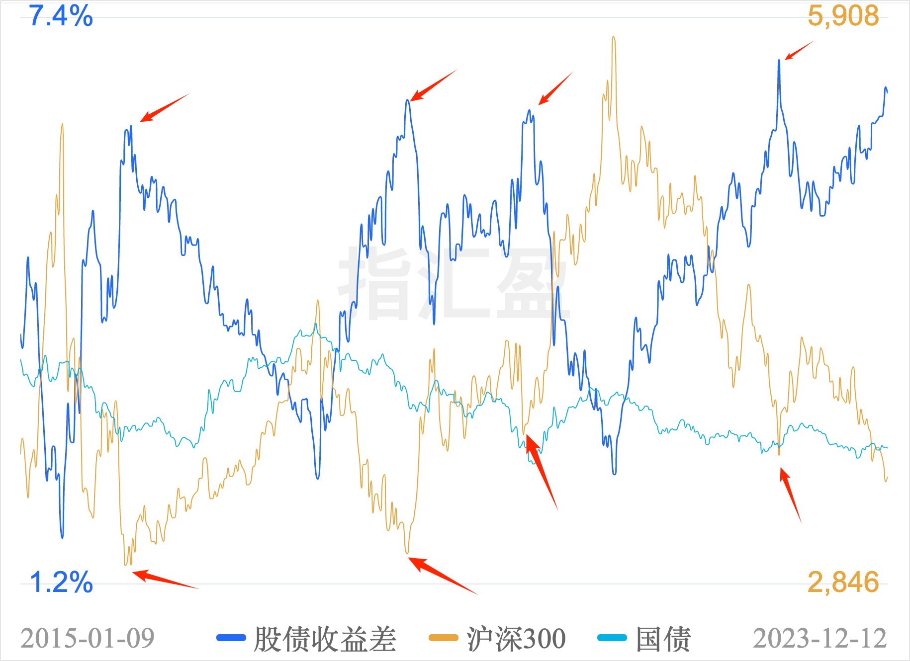 下图中深蓝色线是股债收益差走势,黄色是沪深300走势,每次蓝色线的顶点都精准对应黄色线的底部。