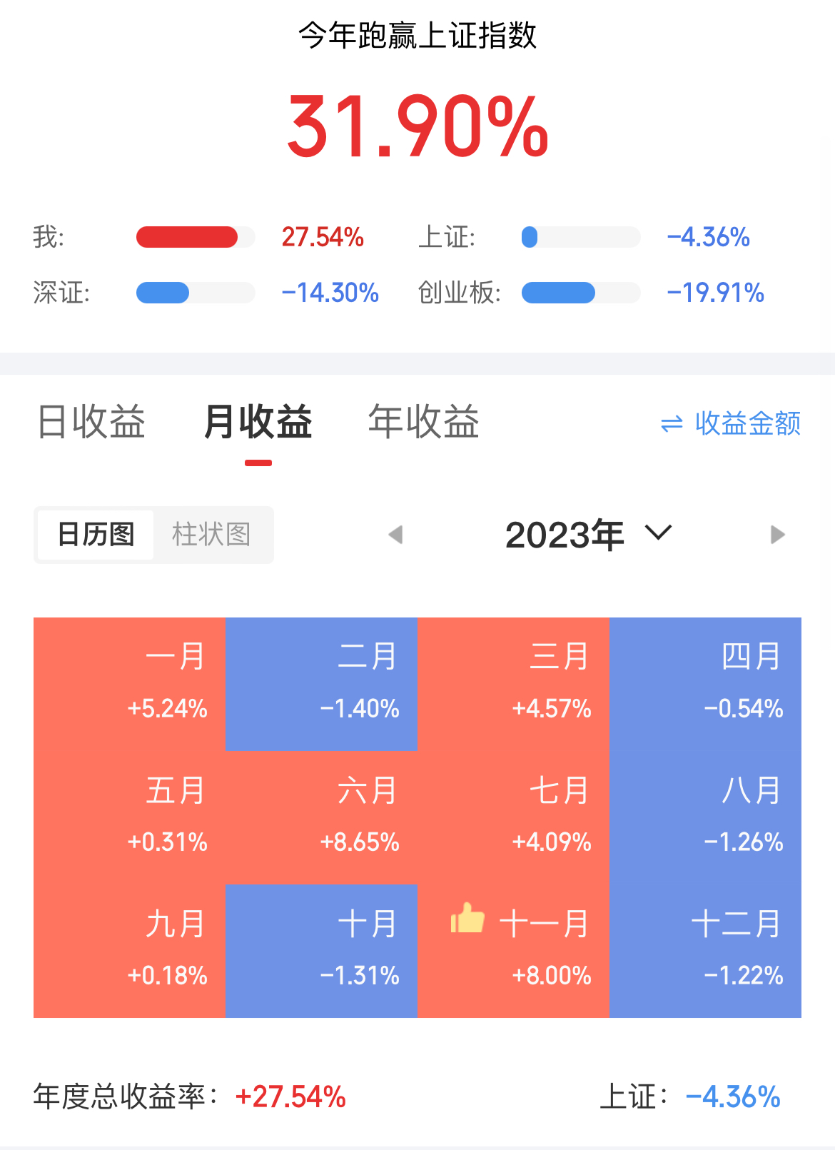 今天大涨终于扬眉吐气了一把,本月亏损收敛到了-1.22%,明天就是本年度最后一个交易日了,希望能继续大涨,让本月收益回正。