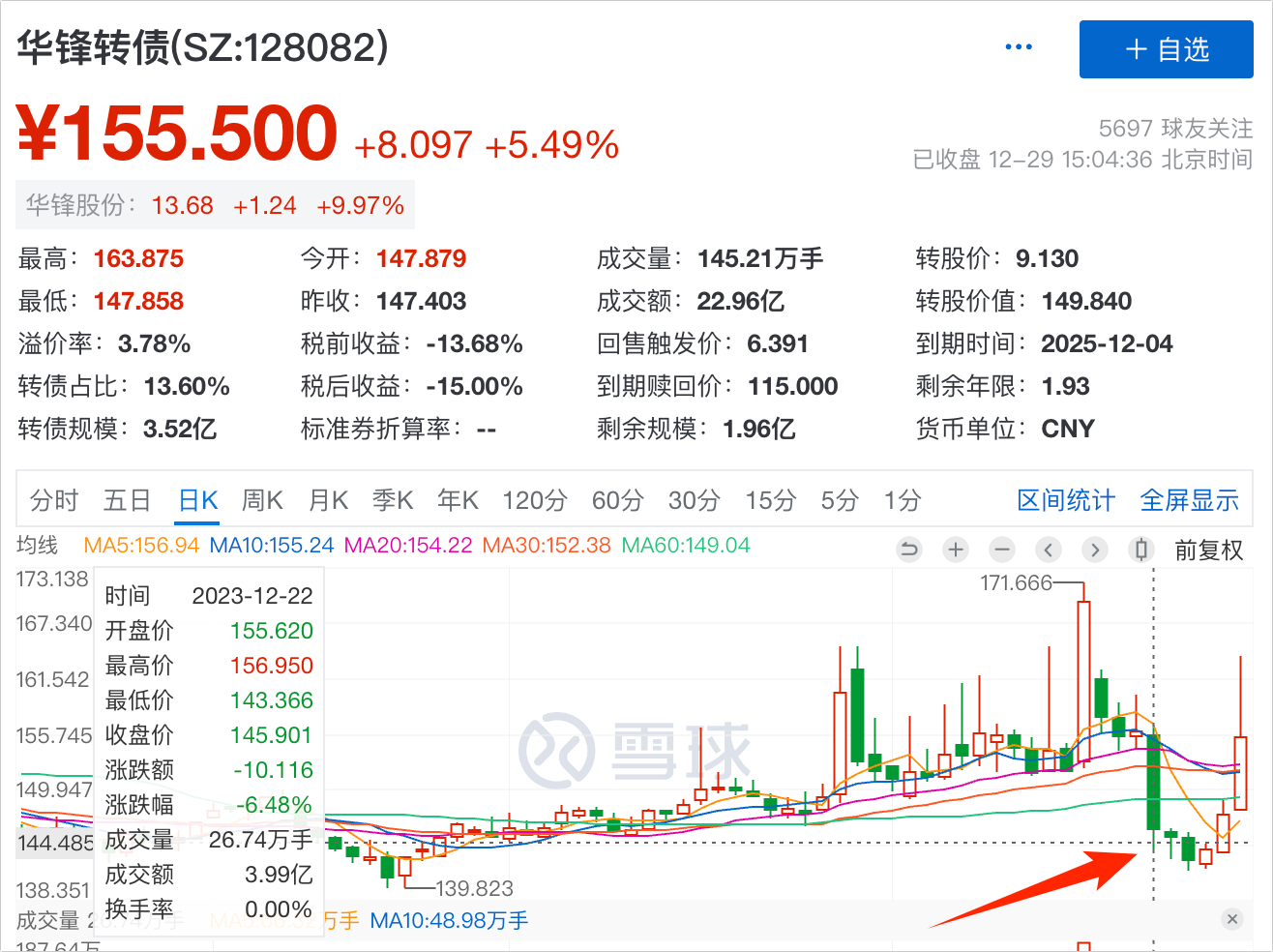 今天呼呼呼地卖出了不少,尤其是吃到了华锋转债的大肉,12-22,144.576建仓,今日均价154.826清仓,持股6天,累计盈利7.09%。当前华锋转债溢价率不高只有3.78%,也没有强赎风险,下周可能会继续表现,但我比较胆小,大肉就留给大家了。清仓的资金切换了聚隆转债。