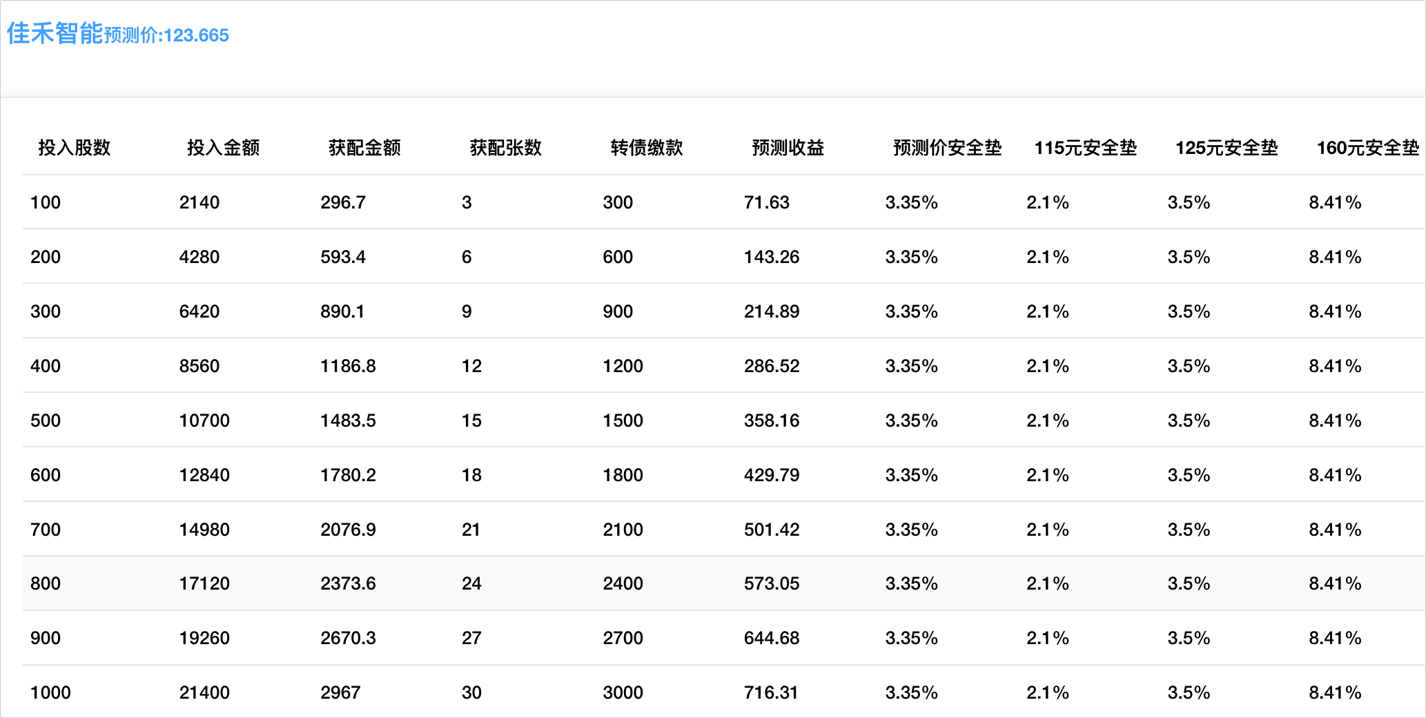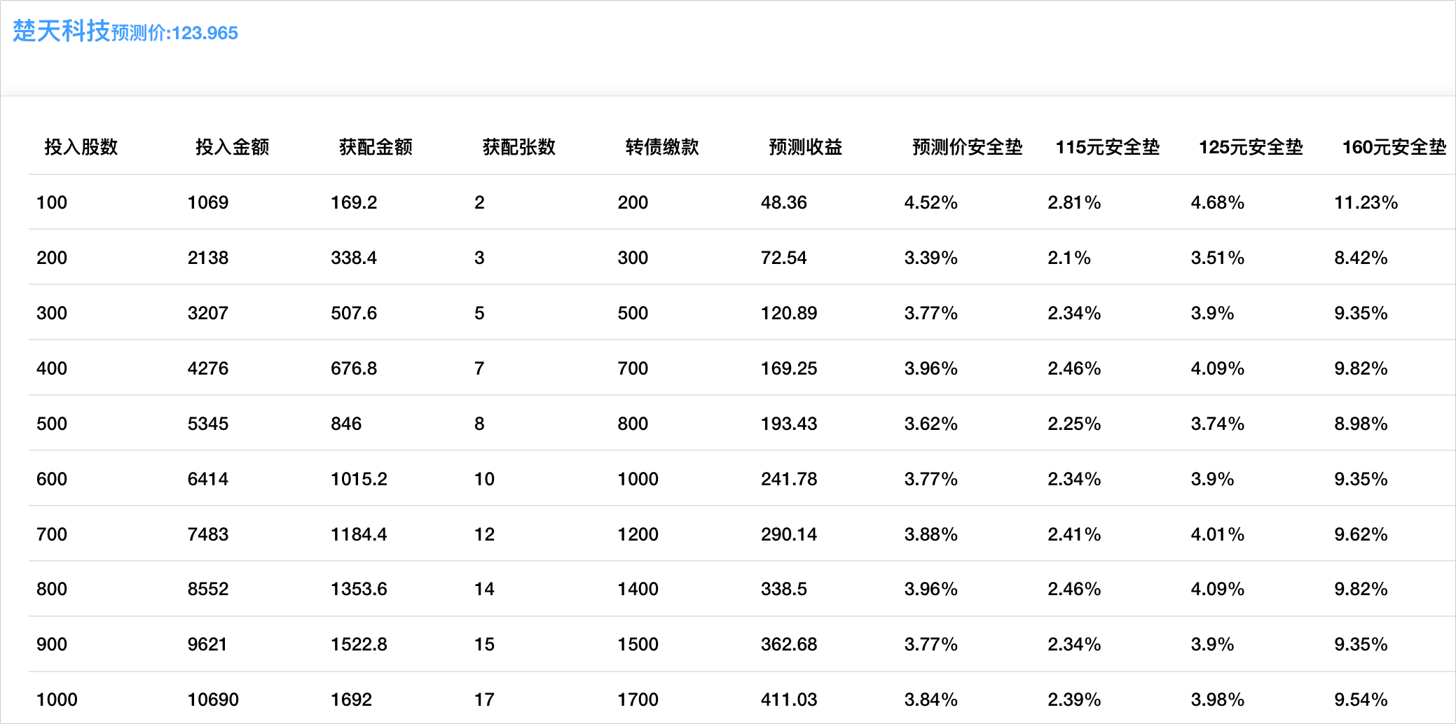程序预测上市价123.665元,配债所需股数和安全垫可以参考下图:
