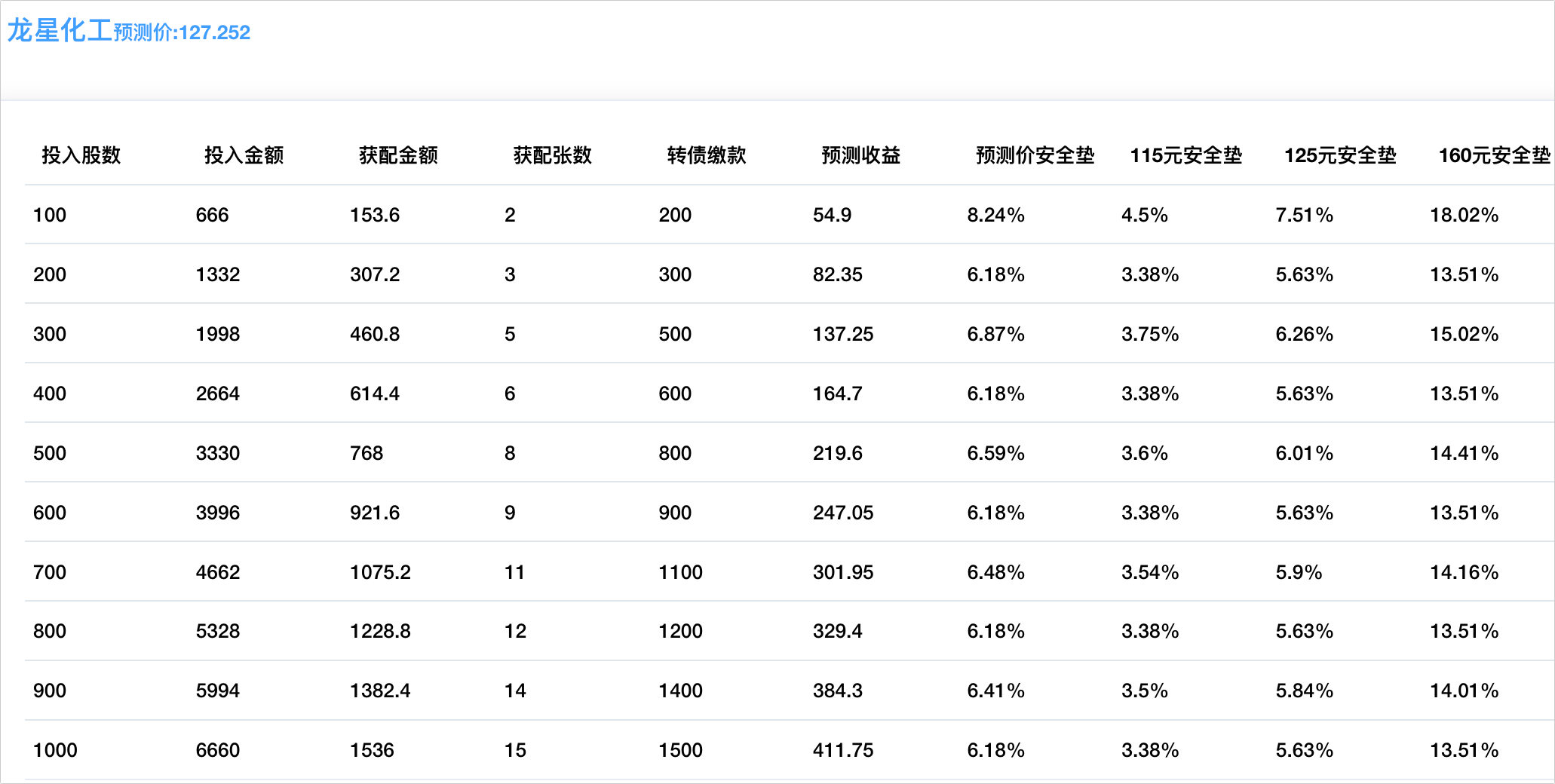 程序预测上市价127.252元,配债所需股数和安全垫可以参考下图: