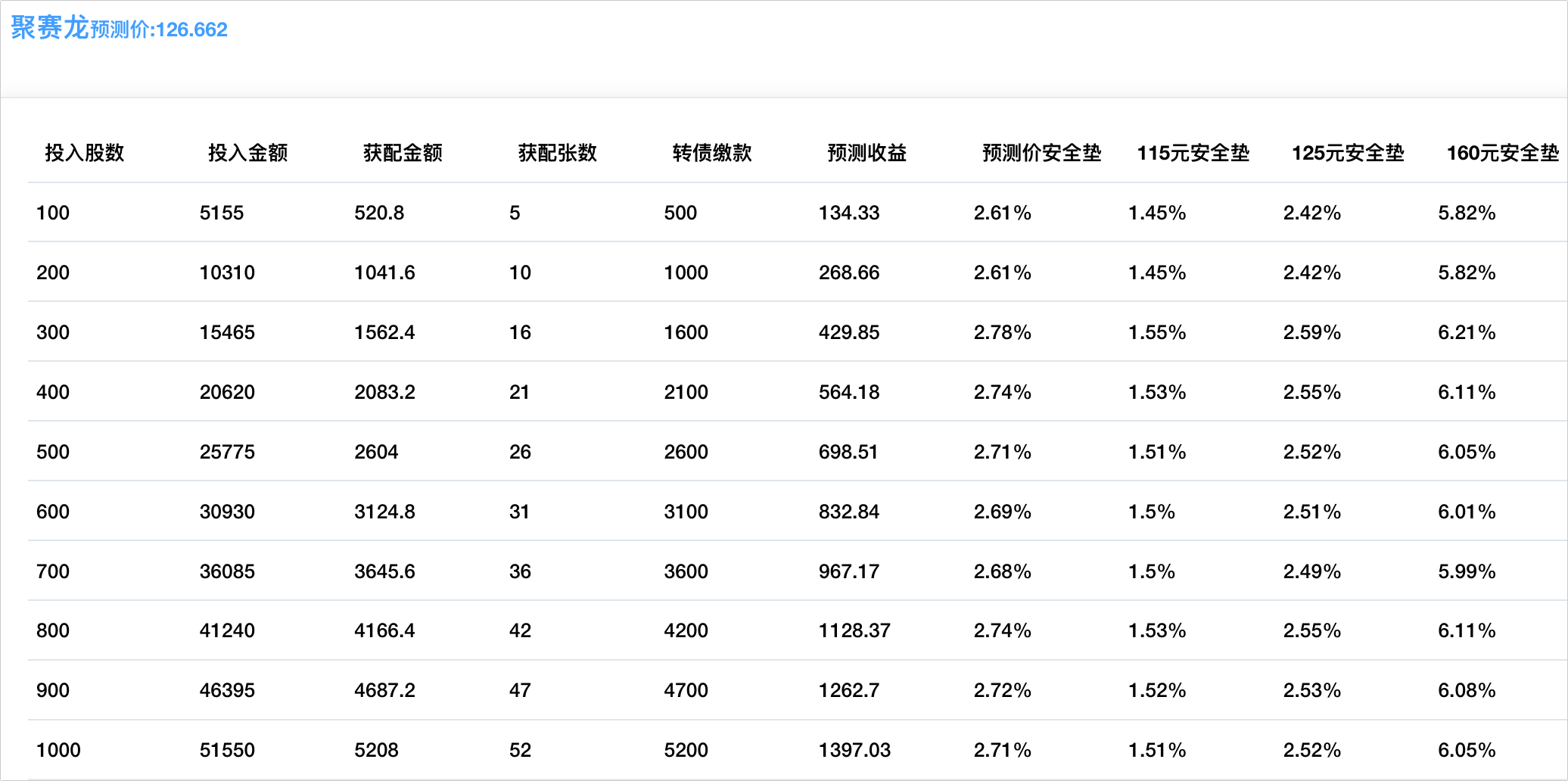 程序预测上市价126.662元,配债所需股数和安全垫可以参考下图: