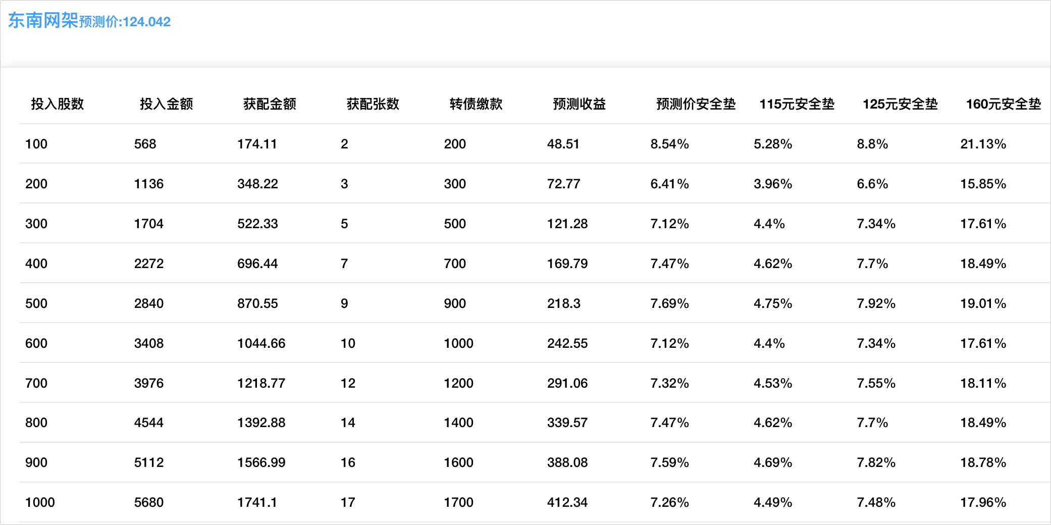 程序预测上市价125.108元,配债所需股数和安全垫可以参考下图: