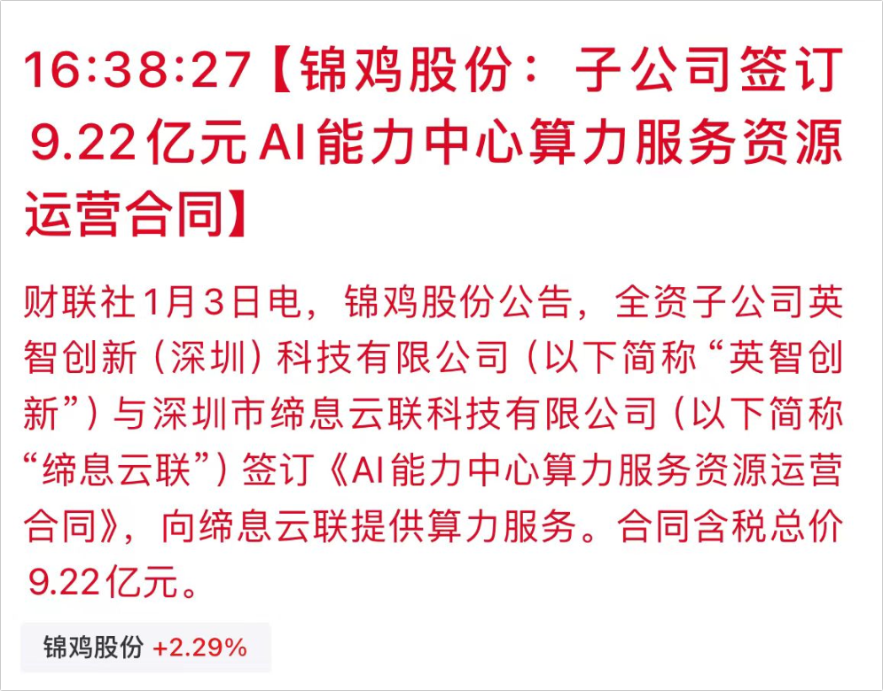 锦鸡股份今天收盘后,爆出大利好:公告全资子公司英智创新科技有限公司与深圳市缔息云联科技有限公司签订《AI能力中心算力服务资源运营合同》,向缔息云联提供算力服务。合同含税总价9.22亿元。