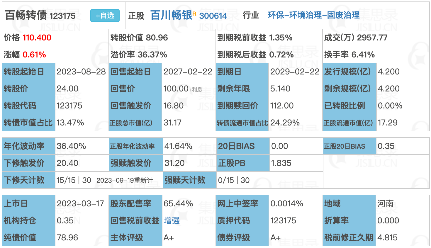2)百畅转债,提议下修,2023-09-18刚刚主动下修过一次。当前参数见下图: