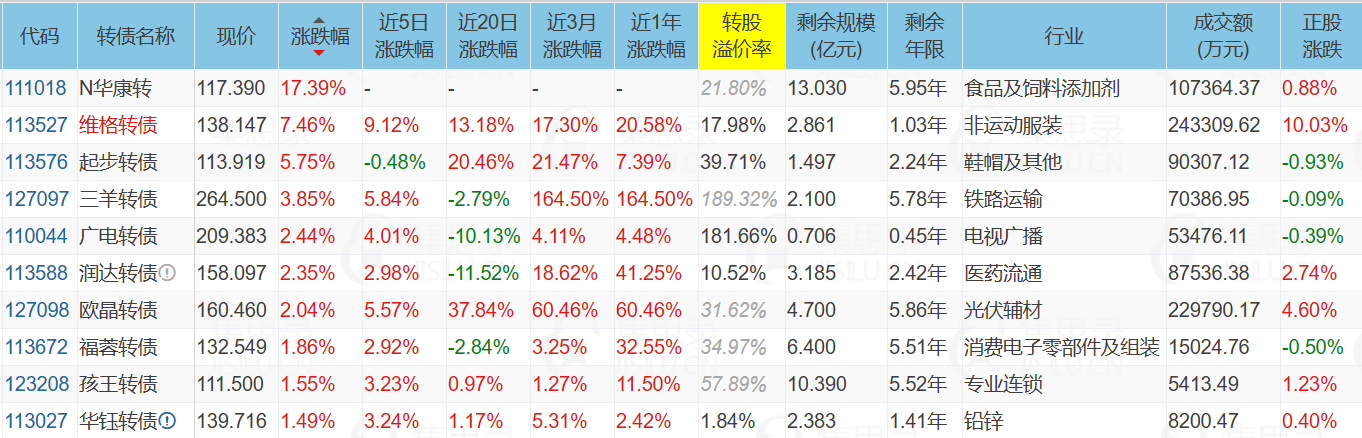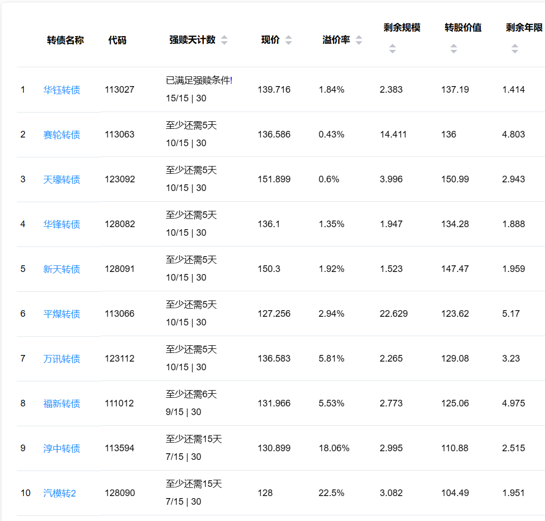 1)华钰转债,盘后公告未来3个月不强赎,当前价格139.716元,溢价率1.84%,剩余规模2.383亿,剩余年限1.414年。参考历史数据,溢价率有望回升到5%-10%左右。