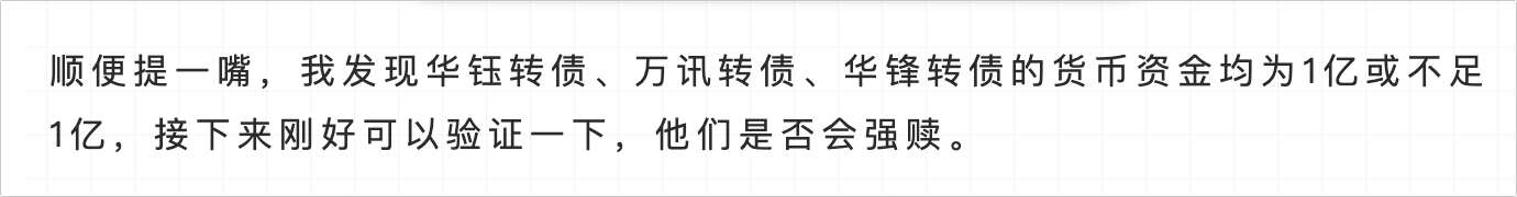另外,我在2024-01-12的文章:一个判断可转债强赎的指标,颇为有效!猜测的华钰转债可能不会强赎,目前已经应验了,接下来继续验证万讯转债和华锋转债。