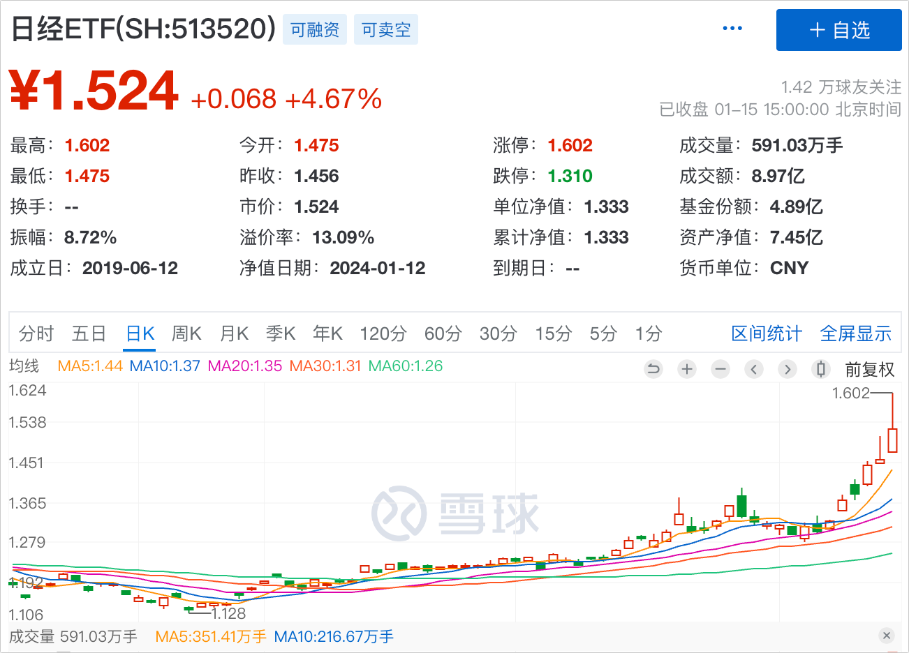 但是要注意,目前这么高的溢价是维持不了多久的,从尾盘日经ETF的涨幅大幅回落5.33%也能看出来,如果没持有,不要去追高。