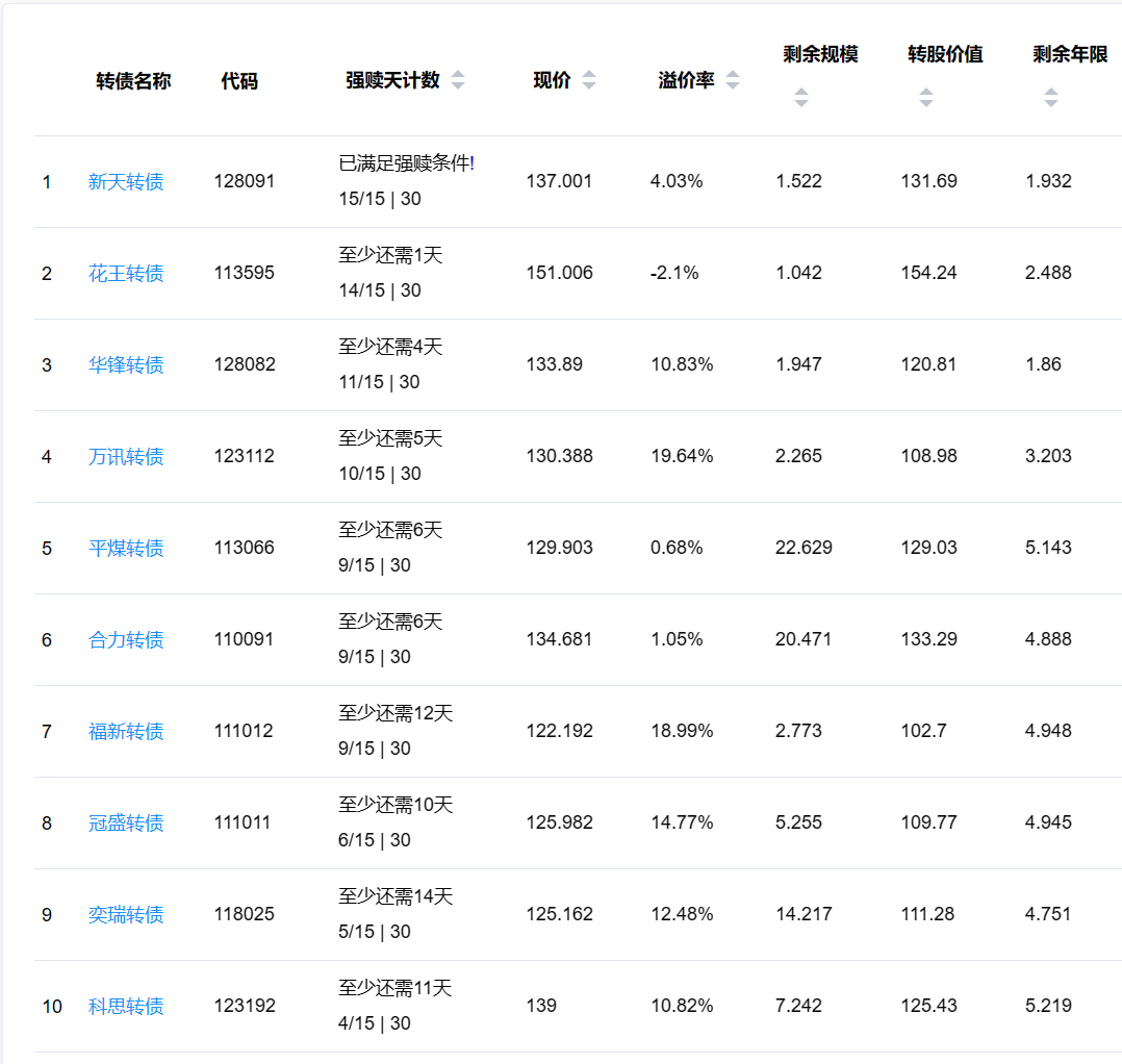 新天转债,盘后公告今年5月31日前不强赎,当前价格137.001元,溢价率4.03%,剩余规模1.522亿,剩余年限1.932年。不强赎时间较短,溢价率不会过分上涨,预估会恢复到10%左右。