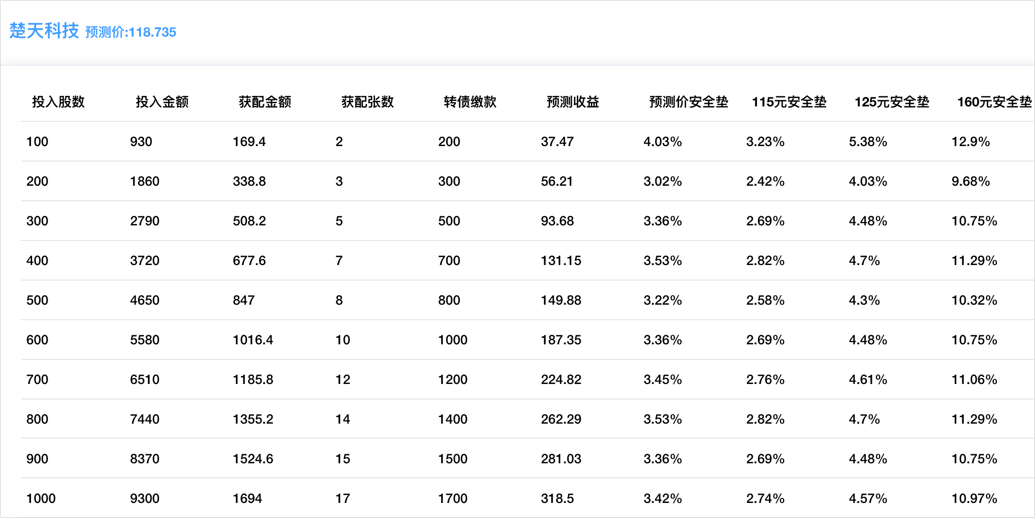程序预测上市价118.735元,配债所需股数和安全垫可以参考下图,我暂时不打算参与配债。