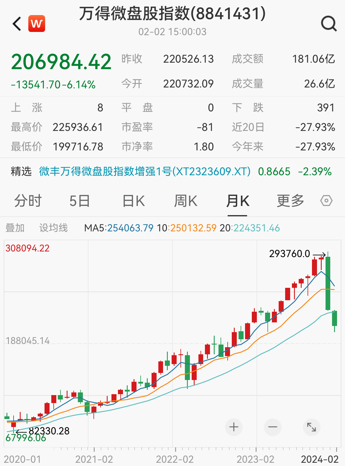 去年涨了一整年的微盘股指数,仅用一个月就跌掉了去年一整年的涨幅,1月份跌了21.28%,2月份2天跌了8.44%,太恐怖了。