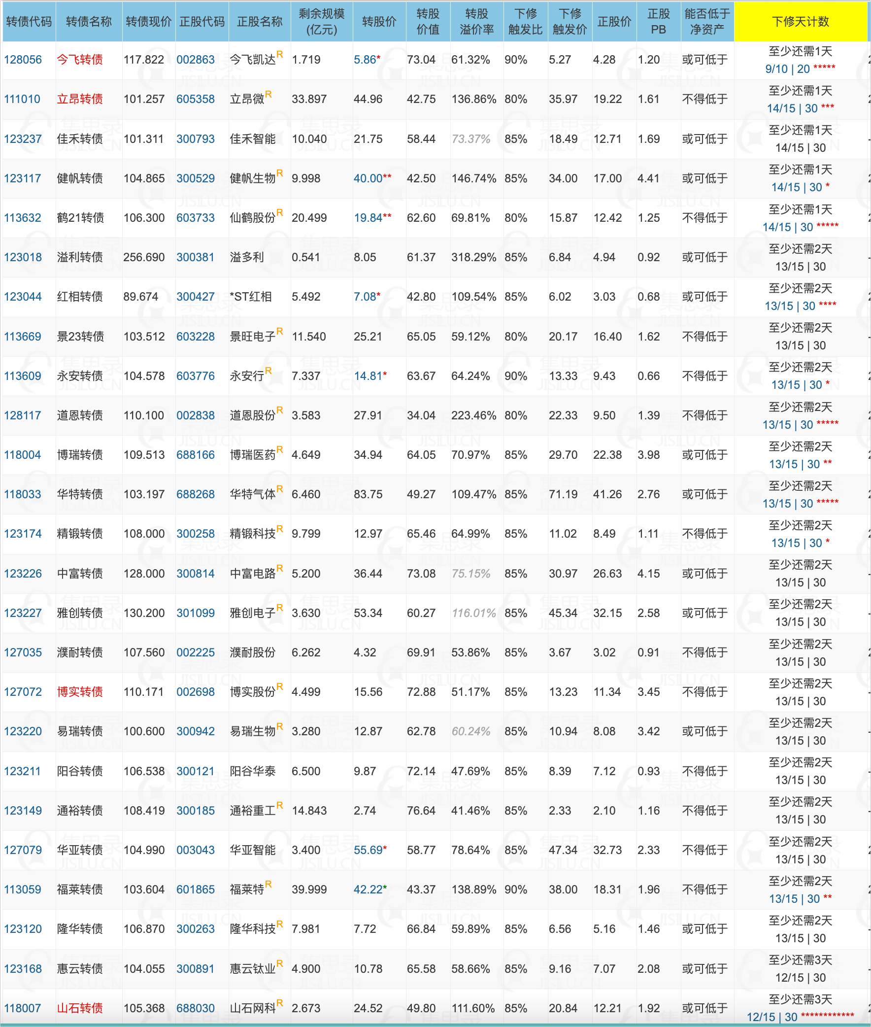 下周有多达45只转债预计会满足下修条件,其中濮耐转债、景23转债、永安转债、精锻转债、红相转债、道恩转债、思创转债、岱美转债、核建转债、天阳转债、海泰转债、世运转债、凯盛转债、星球转债、富仕转债、光力转债、城地转债,个人认为下修的概率稍大一些。