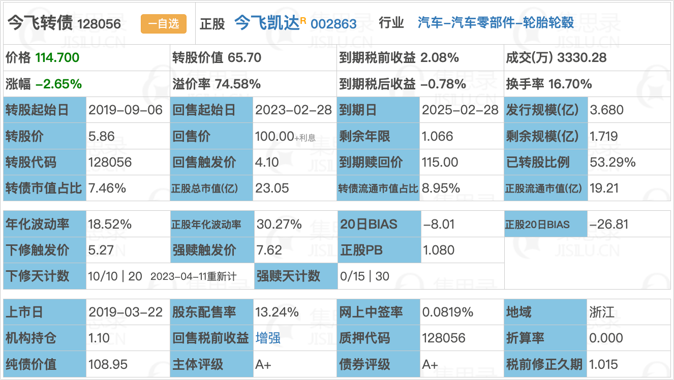 今飞转债,提议下修。2023-04-11主动下修过一次,但是未下修到底,目前参数见下图。