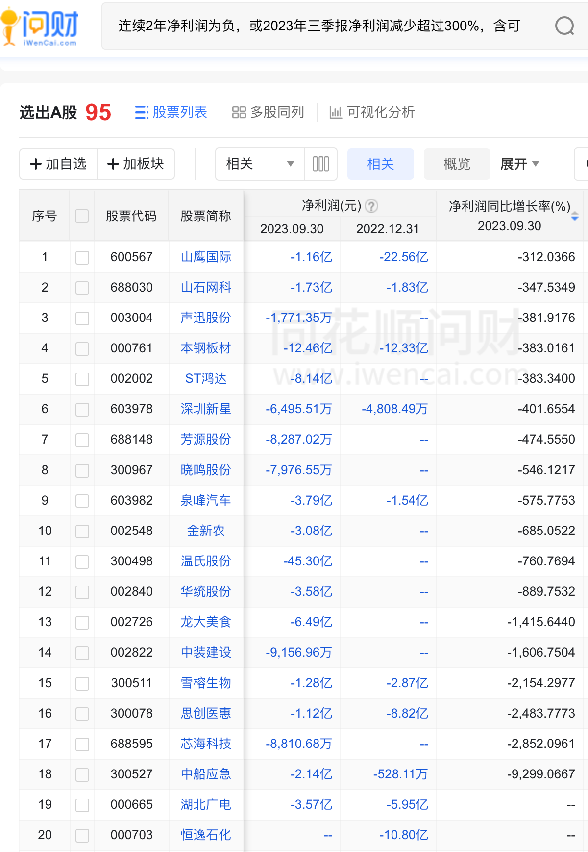 「i问财」网站搜索语句: 连续2年净利润为负,或2023年三季报净利润减少超过300%,含可转债的股票