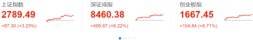 三大指数涨幅最小的是沪指,涨幅也达到3.23%,创业板指收涨6.71%并连续收复1500、1600点整数关口,深成指、科创50涨超6%,北证50涨超9%,北向资金单日大幅流入126.05亿,A股成交额放量至9362.6亿。