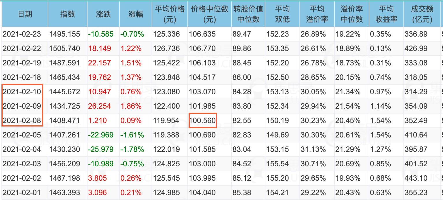2021年,放假前3天的2021/02/08指数探底成功,中位数触底100.56元后开启反转,当时市场的平均收益率来到了1.54%附近,这意味着绝大部分转债都已经进入了保本区间。
