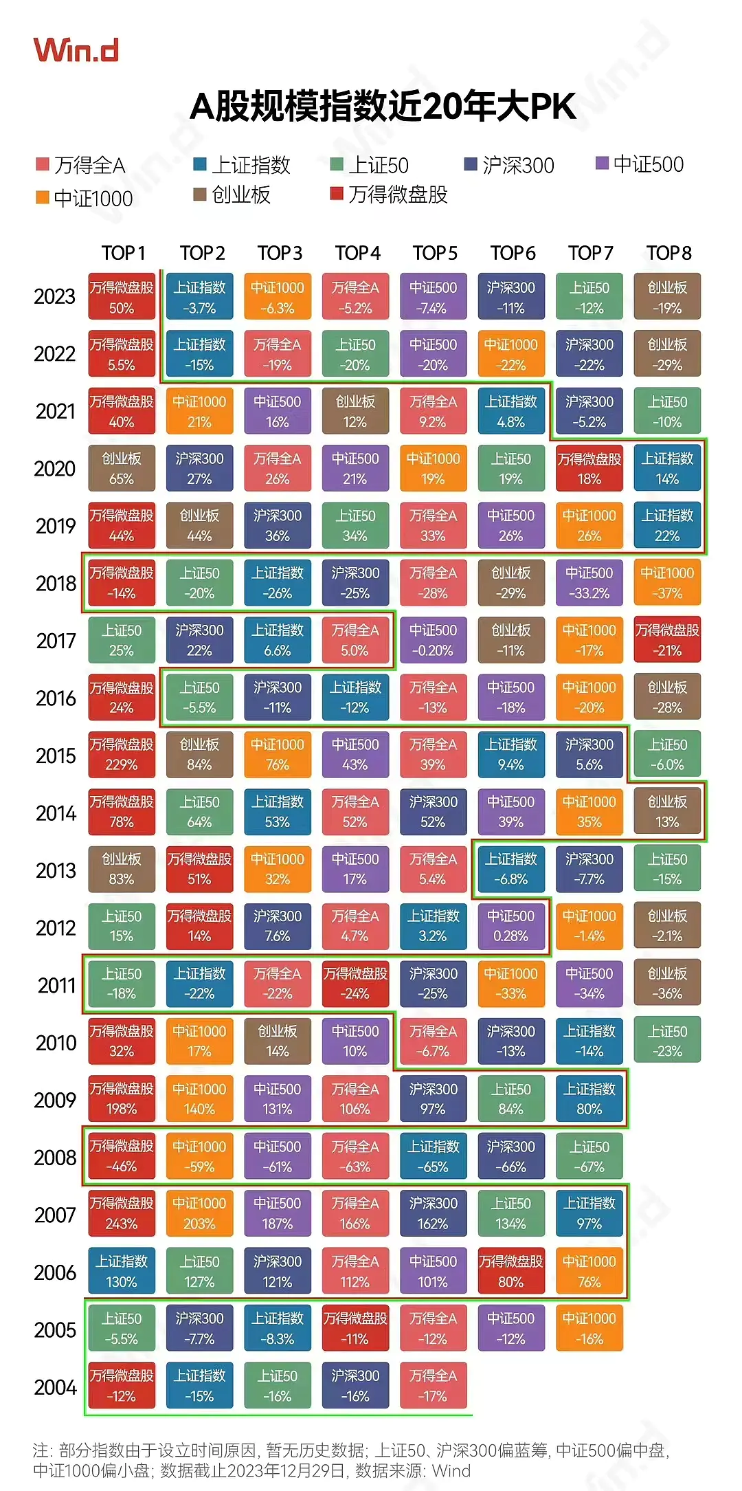 **1)**针对问题一,可以参考wind发布的「A股规模指数近20年大PK」数据,过去的20年里,有15年微盘股指数涨幅都位列第一或第二名,超额收益恐怖如斯。