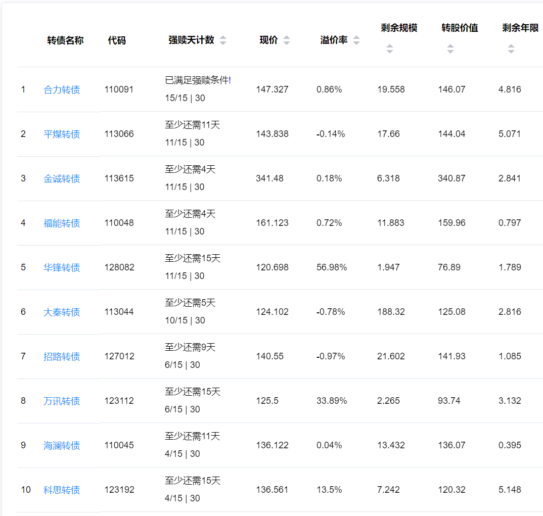 合力转债,未来3个月不强赎。当前价格147.327元,溢价率0.86%,剩余规模19.558亿,剩余年限4.82年。不强赎时间较短,溢价率预估会恢复到5%-10%左右。