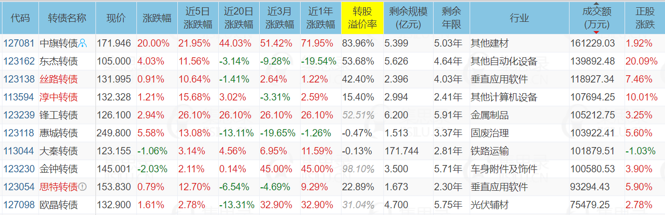 今天涨幅榜第一的中旗转债很奇怪,正股上涨仅1.92%,转债收盘时却20%涨停。