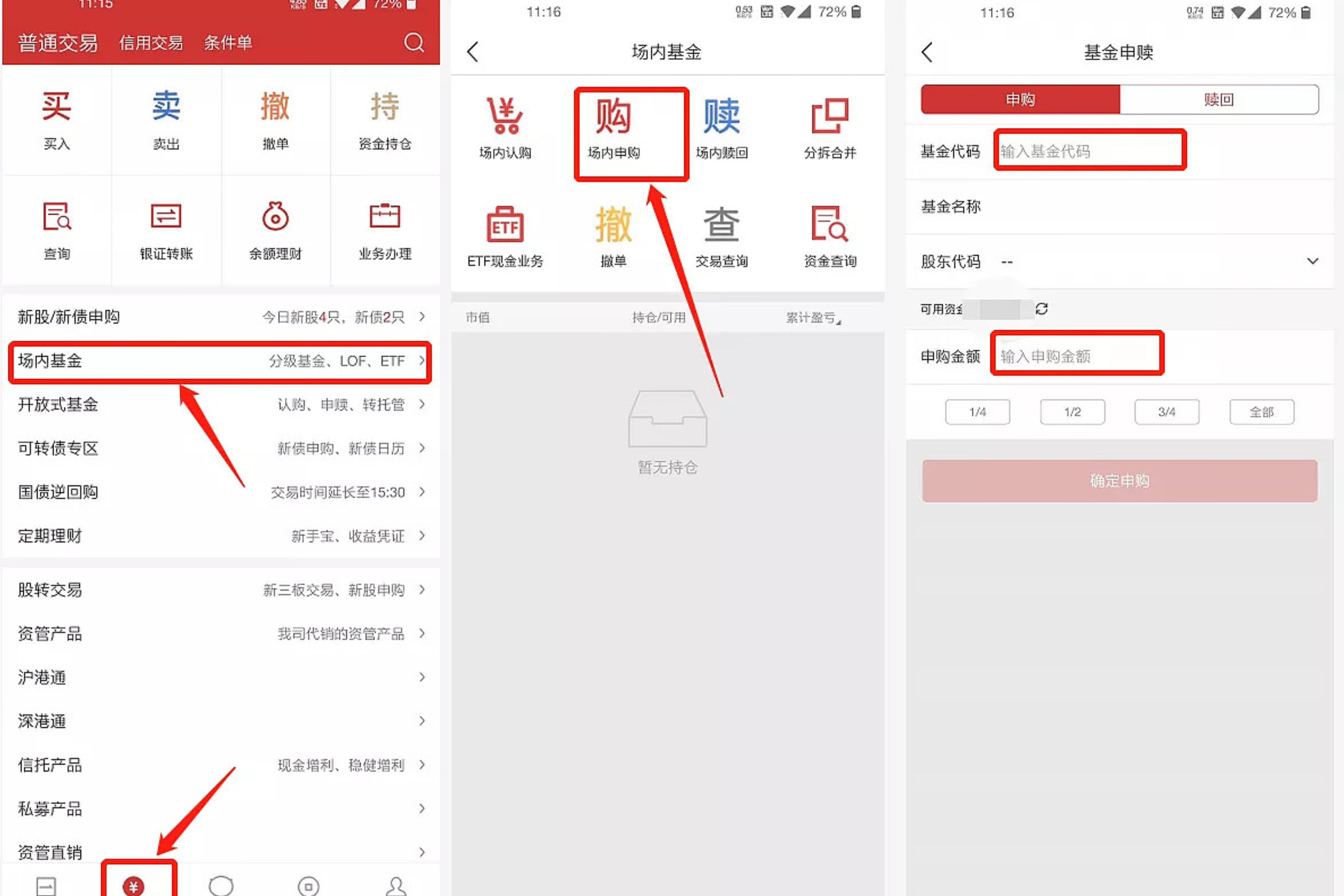 买入方法:如下图,以华宝举例,登陆证券账户→交易→场内基金→场内申购(不是场内认购,认购只针对未上市基金)→输入基金代码→输入购买金额100元→点击申购