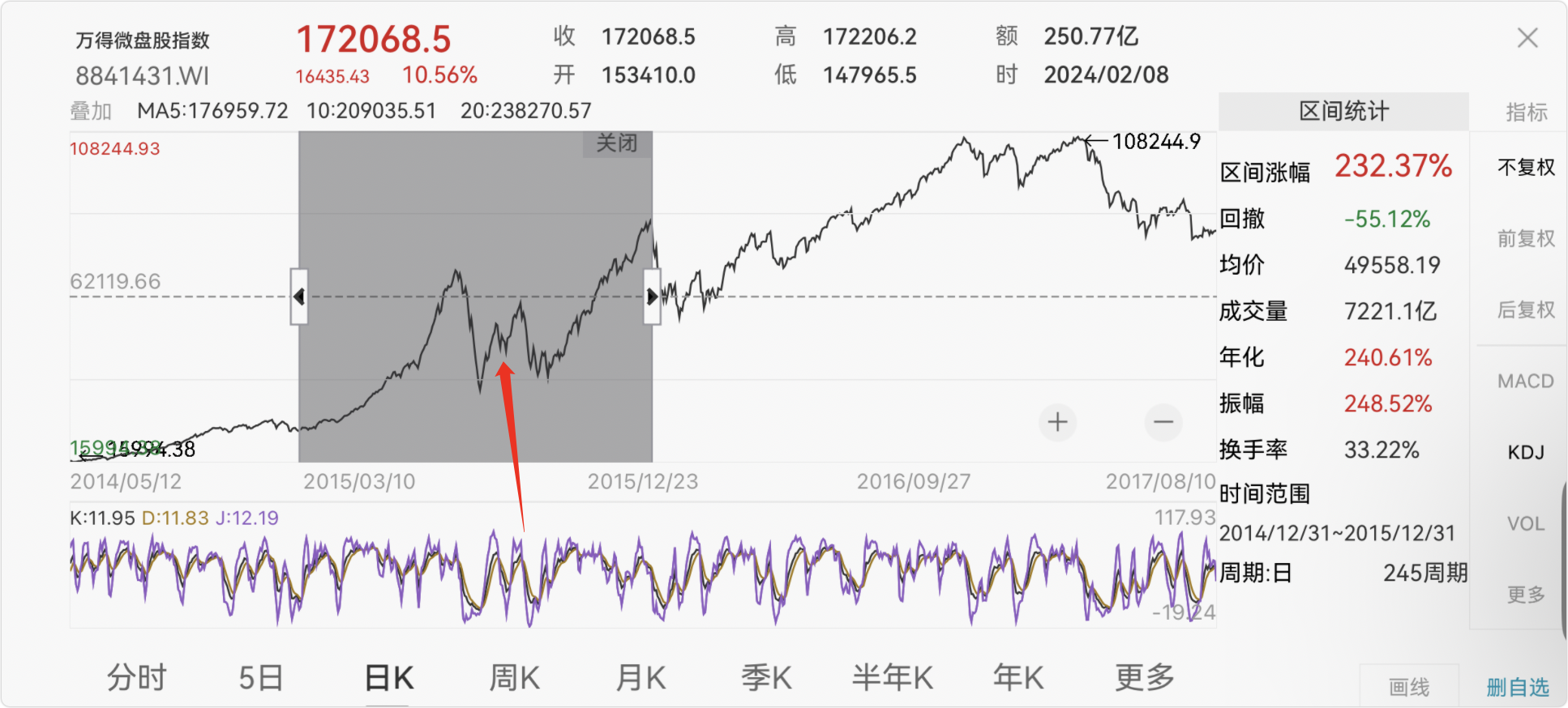 昨晚的文章:接下来市场大概率会这样走我提出了市场的5个阶段,目前1、2已经吻合,第3阶段也80%吻合,今天微盘股的回调,就很像下图箭头里的第3阶段的回调,当时也是10%级别的,随后又上冲一波,属于倒车接人。