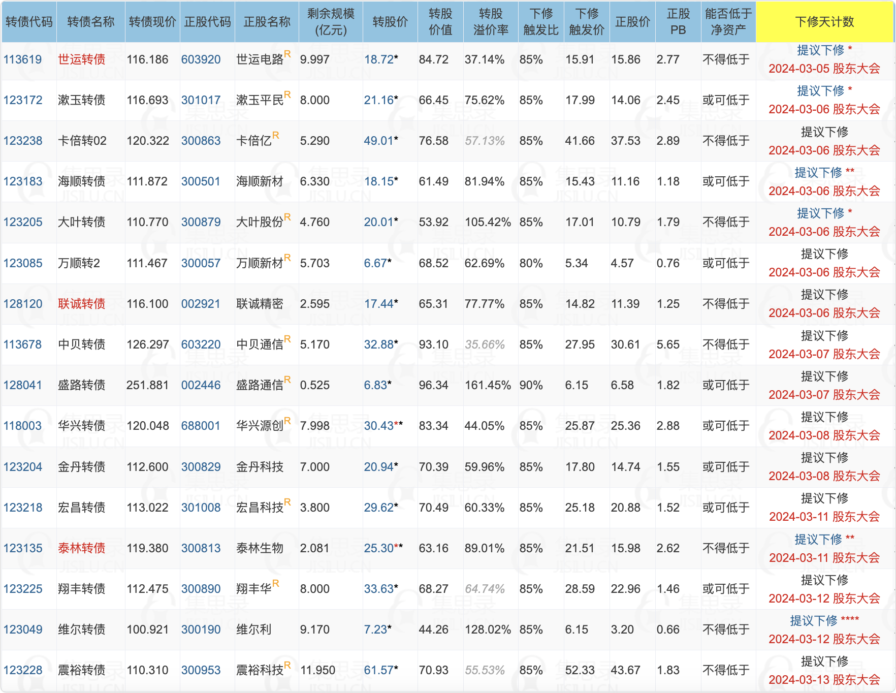 目前加上今晚提议下修的岱美转债、迪贝转债,还在等待下修股东大会的转债多达18只。