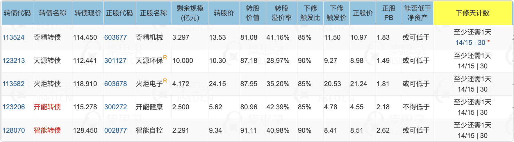 奇精转债、天源转债、火炬转债、开能转债、智能转债