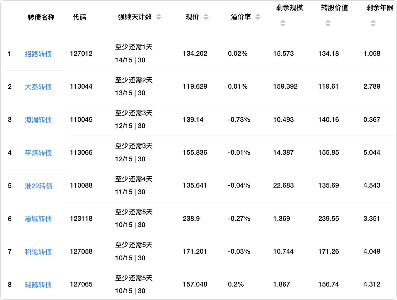 下周以下8只转债可能满足强赎条件,目前溢价率均不高,风险不大。