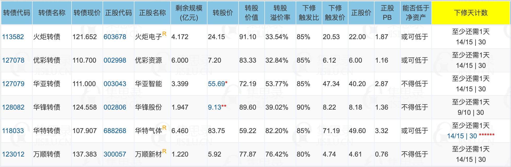 火炬转债、优彩转债、华亚转债、华锋转债、华特转债、万顺转债