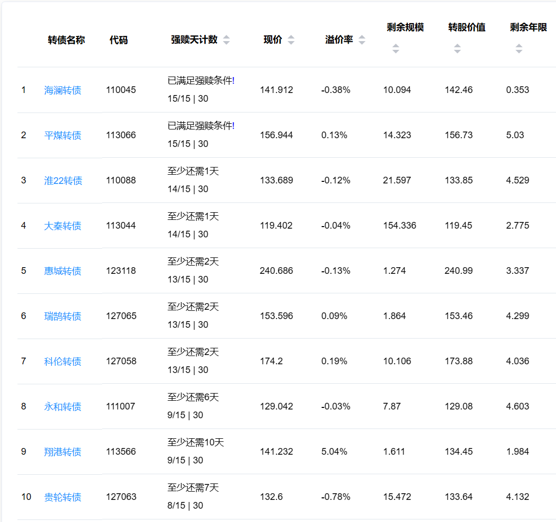 2、即将满足强赎转债