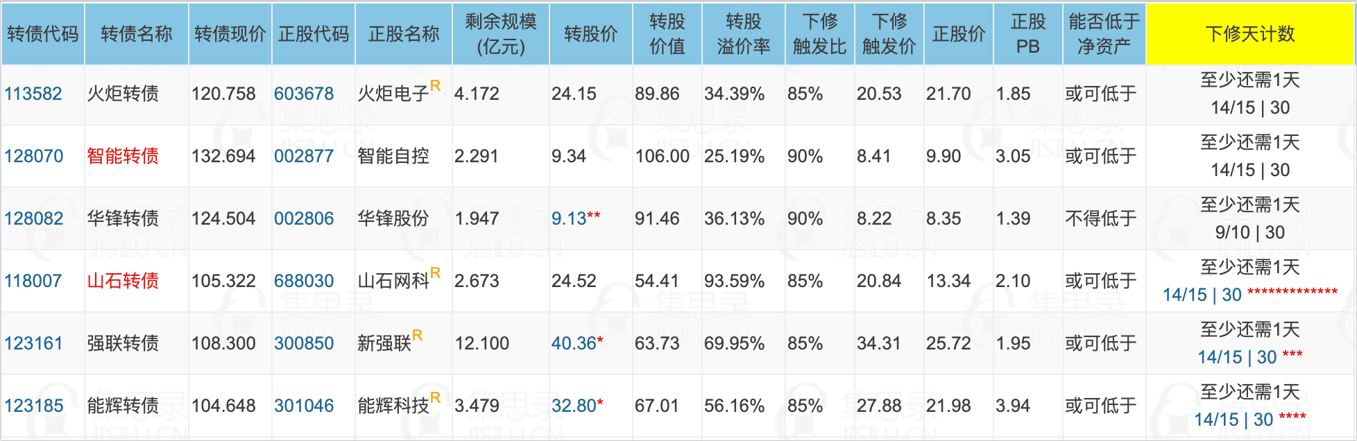 火炬转债、智能转债、华锋转债、山石转债、强联转债、能辉转债