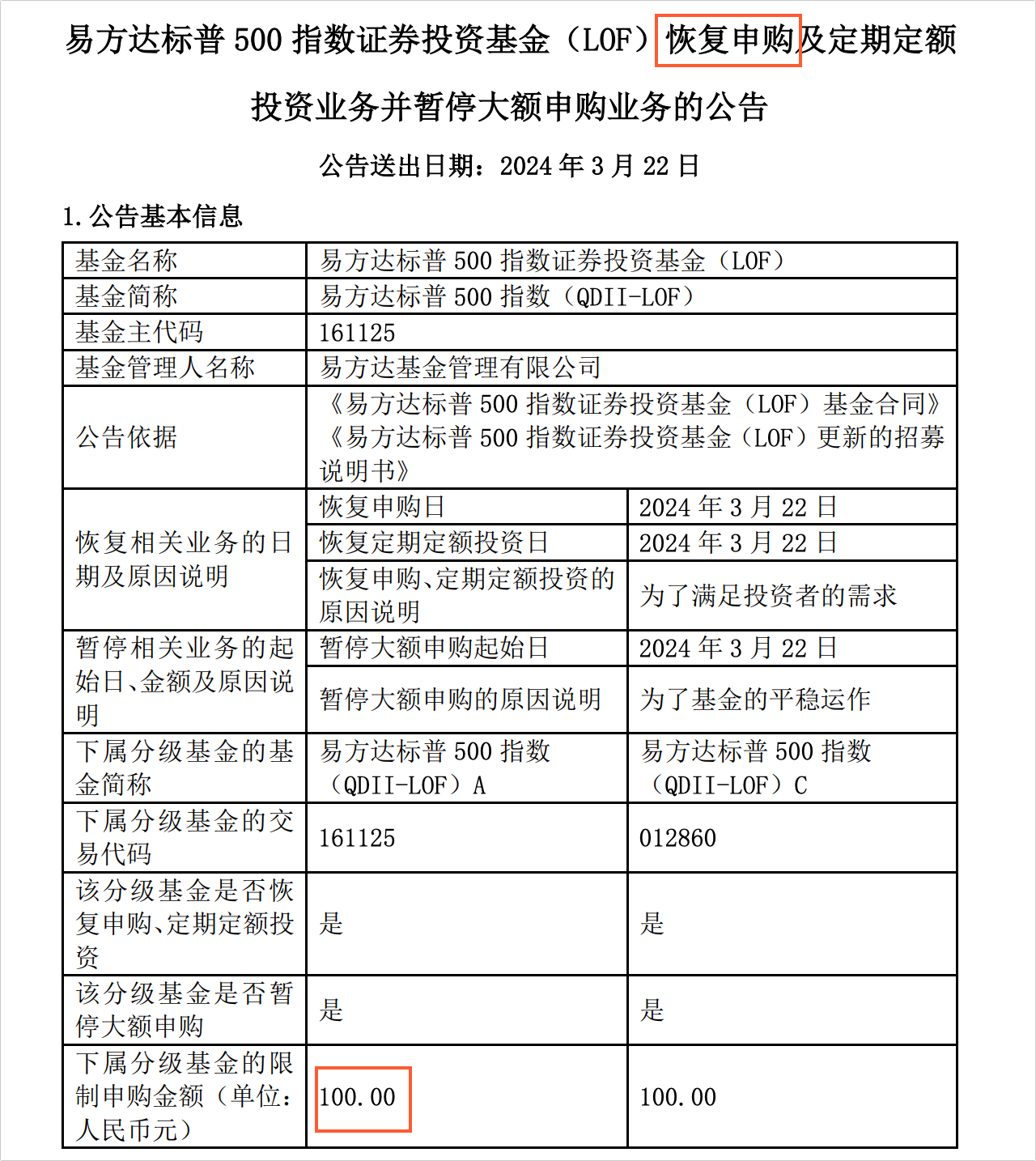 易方达标普500LOF(161125)从明天开始放开申购,每个账户限额申购100元。