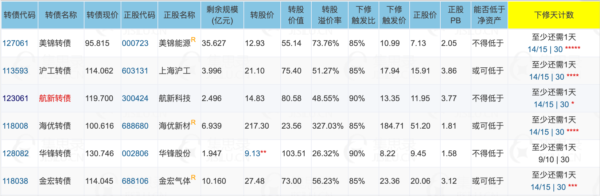 明天最快有5只转债将满足下修条件,分别是:美锦转债、沪工转债、航新转债、海优转债、金宏转债。