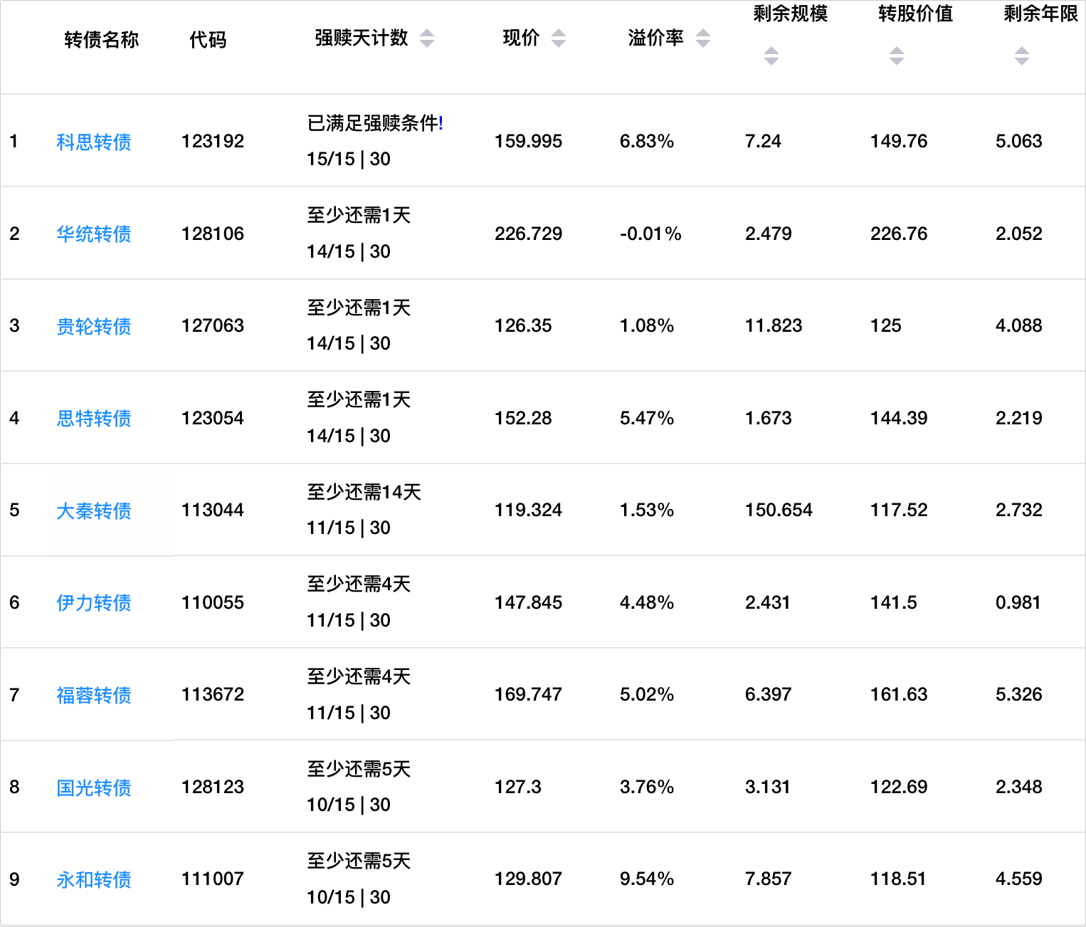 其余8只转债最快下周可能满足强赎条件,要注意溢价率在2%以上的转债,强赎后有杀溢价风险。