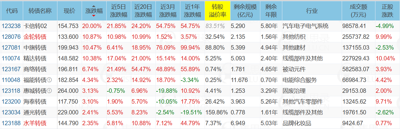 2、卡倍转02,今天正股下跌4.99%,转债反而大涨20%,和中富转债一样的次新妖债炒作逻辑,上周五的文章有分析过,次新妖丽岛转债、泰坦转债也如期大跌。