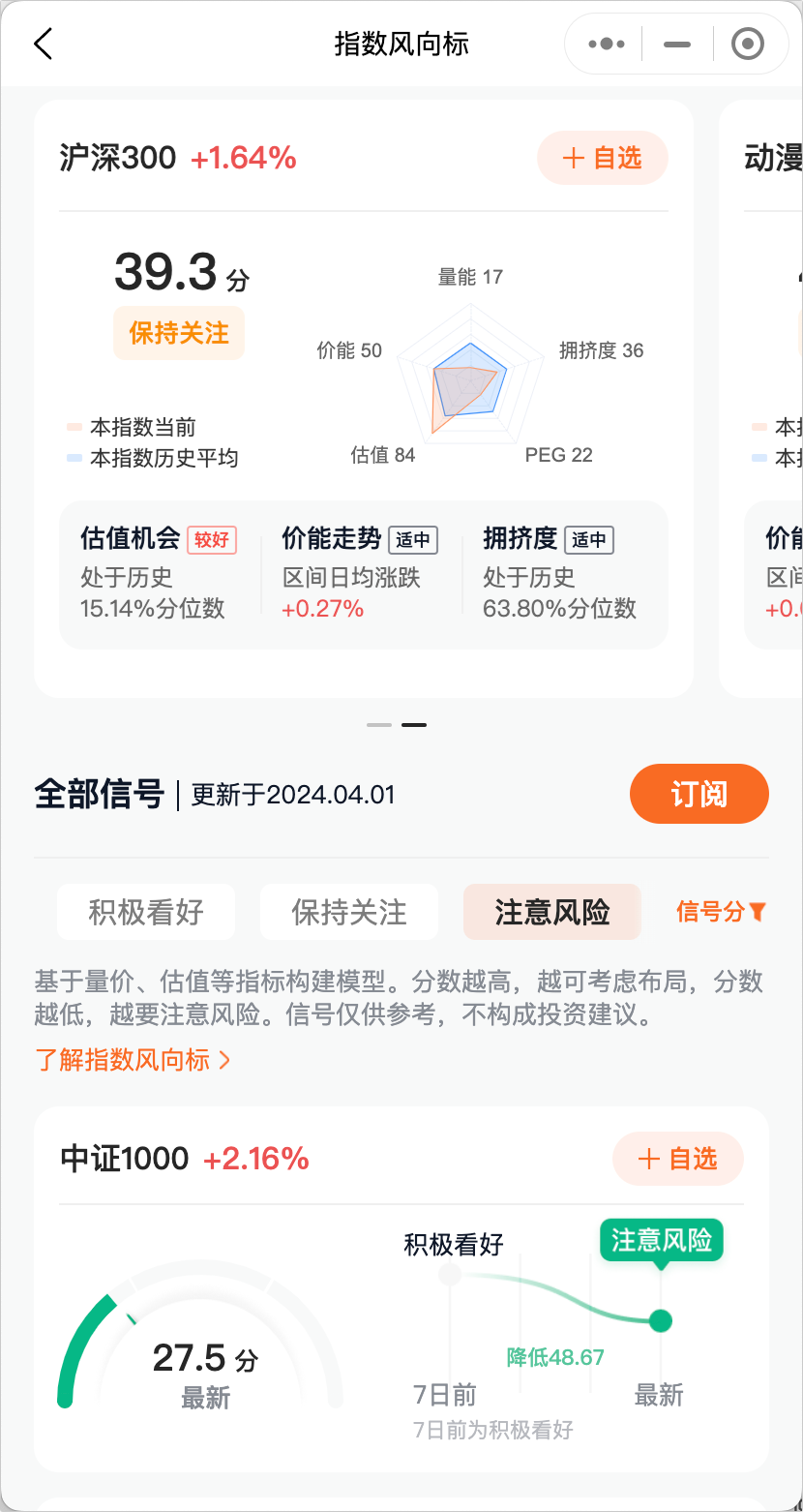指数风向标栏目,页面上方会列出自己关注的ETF目前的性价比,从估值机会、佳能走势、拥挤度等多方面进行判断打分,比如我持仓的沪深300,目前从估值来看,是低位无疑,可以继续持有,未来如果持续上涨出现风险,我也能从拥挤度和量能指标中看出来。