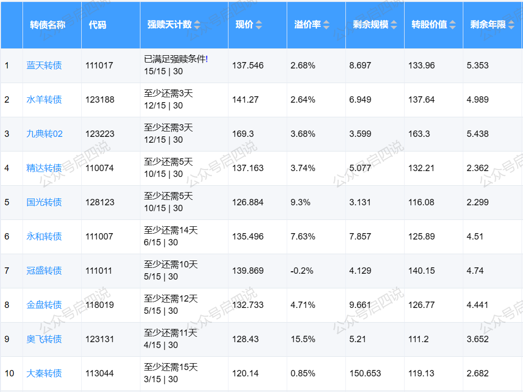 下面这些转债,要注意强赎杀溢价风险,尤其是溢价率在5%以上的。