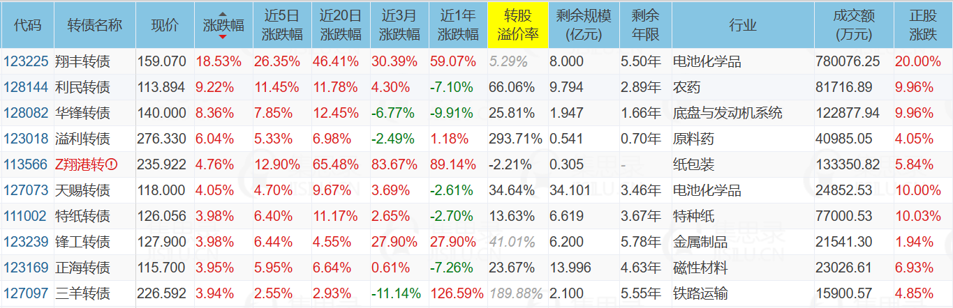 冠盛转债、德尔转债、翔丰转债、宏丰转债、国泰转债、丰山转债、利元转债、宙邦转债、天赐转债、道氏转02、章鼓转债、豪鹏转债、海顺转债、利民转债、华正转债、恩捷转债、冠宇转债、锂科转债、嘉元转债、天奈转债